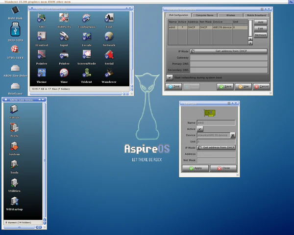 AspireOS. является дистрибутивом, созданным в 2011 году Никосом Томатсидисом и ориентирован на улучшенную поддержку линейки компьютеров Acer Aspire One (данные компьютеры выпускаются с самым разным программным обеспечением). Однако, сам дистрибутив возможно установить на любое оборудование поддерживающее AROS как таковой.