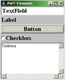 - Базовый набор виджетов графического интерфейса, таких, как кнопки, текстовые поля (text box) и меню. Она также предоставляет AWT Native Interface, который позволяет библиотекам в нативном коде рисовать непосредственно на