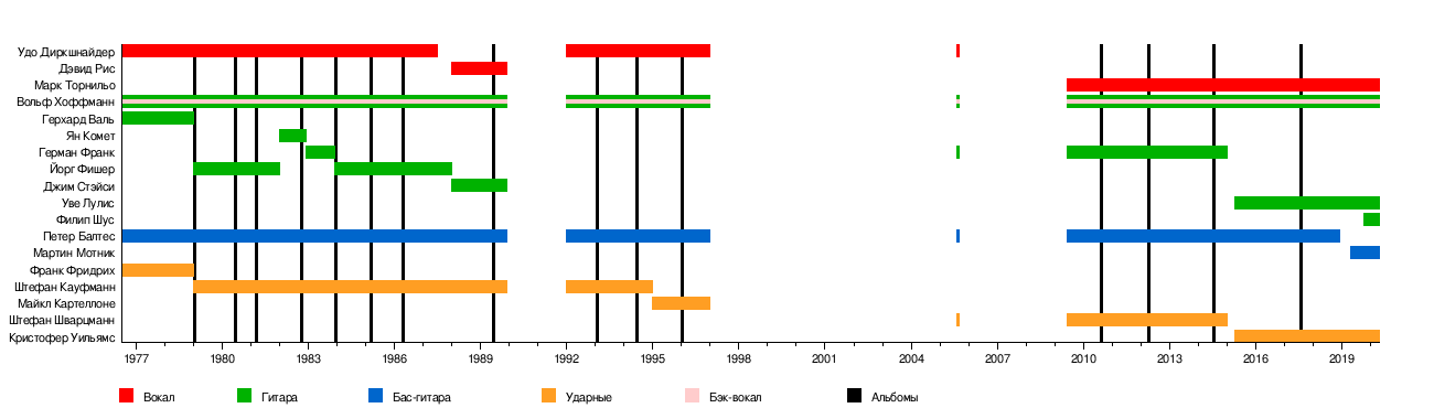Более или менее стабильный состав группы образовался только в 1975 году, и состоял из Диркшнайдера (вокал), Вольфа Хоффманна (гитара), Герхарда Шталя (гитара), Дитера «Руби» Рубаха (бас) и Франка Фридриха (ударные). В 1976 году группу покинул басист и на его место пришёл Петер Балтес. Интересно то, что изначально он был басистом вовсе не по призванию, а по воле случая — в той группе, где он играл было три гитариста, и на басу не хотел играть никто. Вопрос решили простым способом — Петер Балтес вытянул короткую спичку.