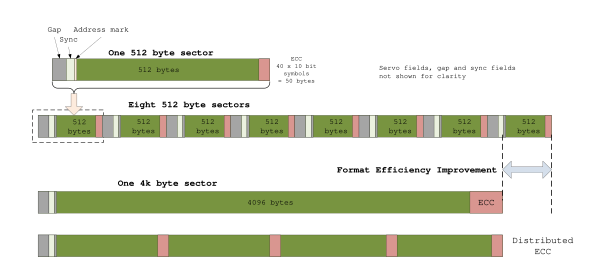 В прежнем формате для кода коррекции ошибок (ECC) использовалось поле длиной 50 байт, что обеспечивало эффективность форматирования (отношение доступного пользователю объёма накопителя к его фактическому объёму) 87 %. В Advanced Format длина поля коррекции ошибок составляет 100 байтов (на 4096 байтов данных). В результате эффективность форматирования удалось повысить до 96 %, а объём доступного пользователю дискового пространства увеличивается на 7-11 %[2].
