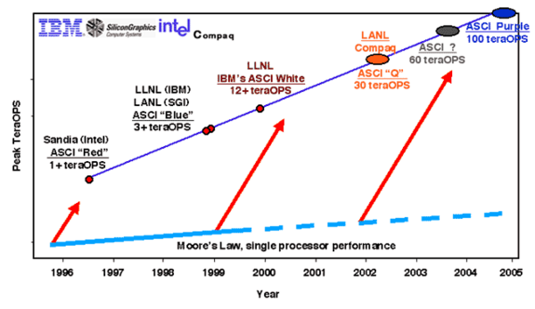 | 2000 | ASCI White | Ливерморская национальная лаборатория | компьютерный кластер на многопроцессорных серверах IBM RS/6000 SP. Достигнута производительность 12 Тфлопс. Списан 27 июля 2006 года. |