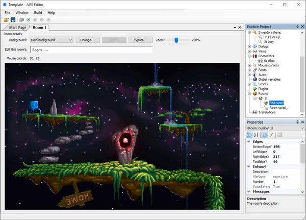 Есть возможность запуска в полноэкранном и оконном режимах, имеется поддержка различных эффектов со звуком, скроллинг комнат. В комплект с конструктором входит полноценная документация на английском языке, в которой имеется подробное руководство и пример создания игры.