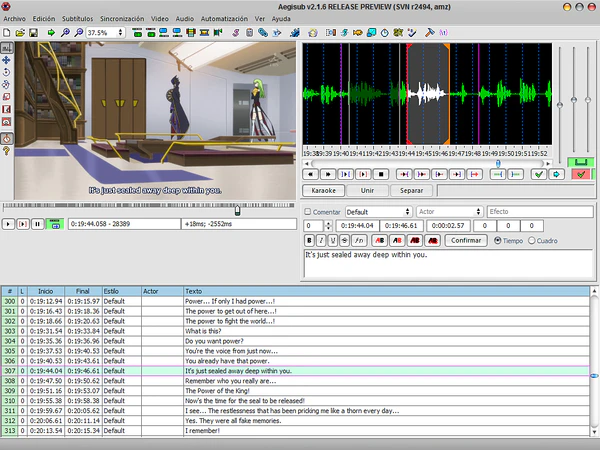 Aegisub — кроссплатформенный редактор субтитров с открытым исходным кодом. Популярен среди фансаберов. Имеет расширенные возможности по созданию караоке. Включает в себя проверку орфографии и редактор переводов. Поддерживает в качестве субтитров SRT, ASS, SSA, SUB, XSS, PSB и форматированный TXT. Для тайминга в неё можно загрузить аудиофайлы в форматах WAV, MP3, OGG Vorbis, FLAC, MP4, AC3, AAC и MKA, видеофайлы — в форматах AVI, AVS, D2V, MKV, OGM, MP4, MPEG, MPG и VOB. Имеет возможность работы с анаморфным видео.