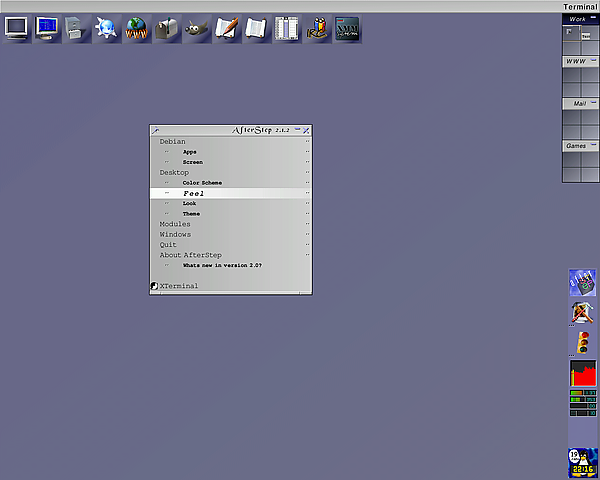 AfterStep поддерживает виртуальные экраны. Настройка внешнего вида производится при помощи набора текстовых файлов конфигурации.