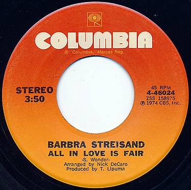 Американская вокалистка Барбра Стрейзанд записала свою версию «All in Love Is Fair» в 1974 году для своего пятнадцатого студийного альбома The Way We Were и выпустила её в качестве сингла. Продюсером записи стал Томми Липума. Песня была тепло принята критиками, которые называли её незабываемой и такой же интересной как и оригинал. В Billboard Hot 100 песня смогла подняться на 63-е место[2], а в топ-чарте синглов Канады — на 60-е[3].