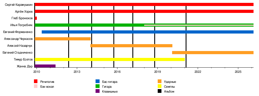 В 2011 году группа стала представлять собой секстет: ударник Александр Черкасов, бас-гитарист Евгений Форманенко, гитарист Илья Погребняк, семплер Тимур Есетов и двое MC — Артём Хорев и Сергей Карамушкин.