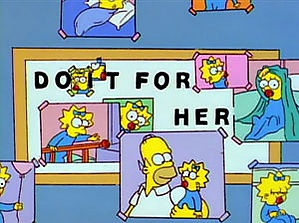 Гомер был не счастлив, когда узнаёт о беременности Мардж, и был полон энтузиазма по поводу предстоящих родов. Из-за финансовых проблем, вызванных беременностью, Гомер был вынужден уволиться из кегельбана и вернуться на электростанцию. Мистер Бёрнс восстанавливает Гомера на его прошлой работе, но помещает в его кабинете большую доску, которая гласит: «Не забывай: ты здесь навеки» (англ. Don't forget: you're here forever). Гомер был снова несчастен на своей работе, но, как и дети, когда Мэгги родилась, Гомер сразу же влюбился в неё. Вернувшись в настоящее, Барт и Лиза все еще не понимают, какое это имеет отношение к фотографиям Мэгги. Гомер упоминает, что они находятся в месте, где он нуждается в них больше всего. Затем показывается кабинет Гомера, где все фотографии Мэгги расположены на стене, в том числе и на доске, которая теперь гласит: «Ты здесь ради неё» (англ. Do it for her).