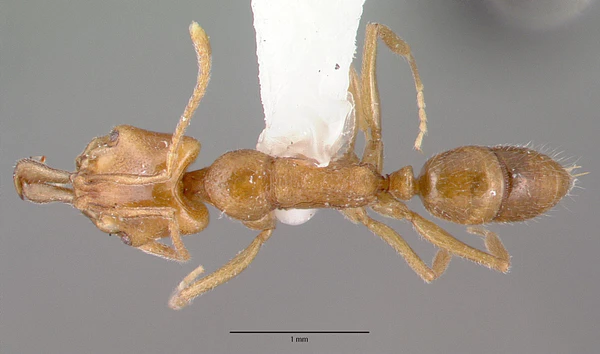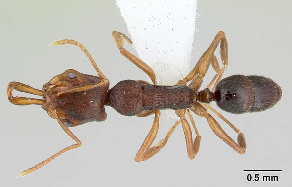 Длина тела от 4,40 до 4,91 мм, длина головы (HL) от 1,09 до 1,13 мм, ширина головы (HW) от 0,98 до 1,00 мм. От близких видов отличается длинным скапусом усика и формой бороздчатого пронотума. Основная окраска красновато-коричневая, ноги и усики желтоватые. Мандибулы прямые, прикрепляются у середины переднего края головы, капкановидно открываются на 180 градусов, равны половине длины головы и несут 3 вершинных длинных зубца. Усики 12-члениковые у рабочих и самок и 13-члениковые у самцов. Нижнечелюстные щупики состоят из 4 сегментов. Стебелёк состоит из одного членика петиоля. Жало развито. Вид был впервые описан в 1870 году, а его видовой статус подтверждён в ходе ревизии, проведённой в 2019 году группой китайских мирмекологов (Zhilin Chen, Zhigang Yang, Shanyi Zhou)[1].