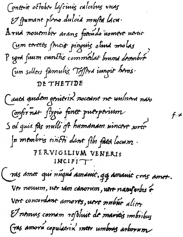 Некоторые из стихотворений антологии приобрели особенную популярность. Одно из наиболее известных латинских стихотворений всех времён — (анонимное) Pervigilium Veneris («Бдение Венеры» или «Ночное празднество Венеры», предположительная датировка IV в. н. э.), со знаменитым рефреном: «Пусть полюбит нелюбивший; кто любил, пусть любит вновь!»[2] «Бдение Венеры» оставалось популярным и в позднейшее время. Сохранилась рукопись XVI в. с копией «Бдения», выполненной выдающимся итальянским поэтом Я.Саннадзаро (см. фото).