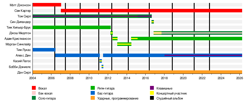 - Том Сирл — соло-гитара, клавишные (2004—2016)