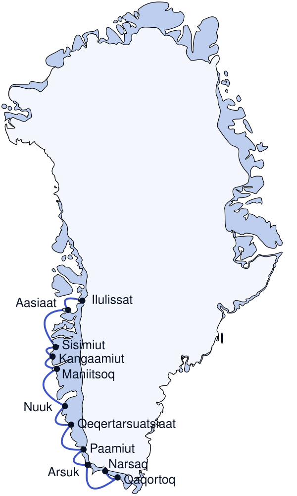 Плаванье в одну сторону в летнее время занимает максимум 75 часов, включая самую длинную, двухчасовую, стоянку в Нууке.