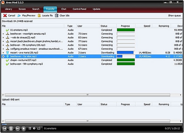 Начиная с версии 1.9.4 поддерживает обмен файлами по протоколу BitTorrent, с версии 1.9.9 экспериментально поддерживает SHOUTcast.