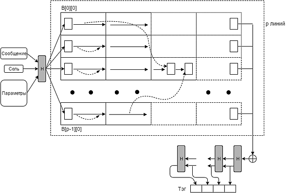 , где — количество блоков памяти размером 1024 байта, — хеш-функция, принимающая на вход 32-битное представление входных параметров, на выходе которой — 64-битное значение, — хеш-функция переменной длины от , — объём памяти, — количество итераций.