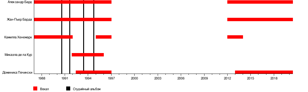 Александр Бард был мозгом группы, он также исполнил основную вокальную партию для хита «Obsession», Жан-Пьер Барда — ведущий вокалист таких хитов, как «Crucified» и «Israelism». Они были в группе на протяжении всей её истории; Барда часто носил наиболее вызывающие и откровенные наряды.