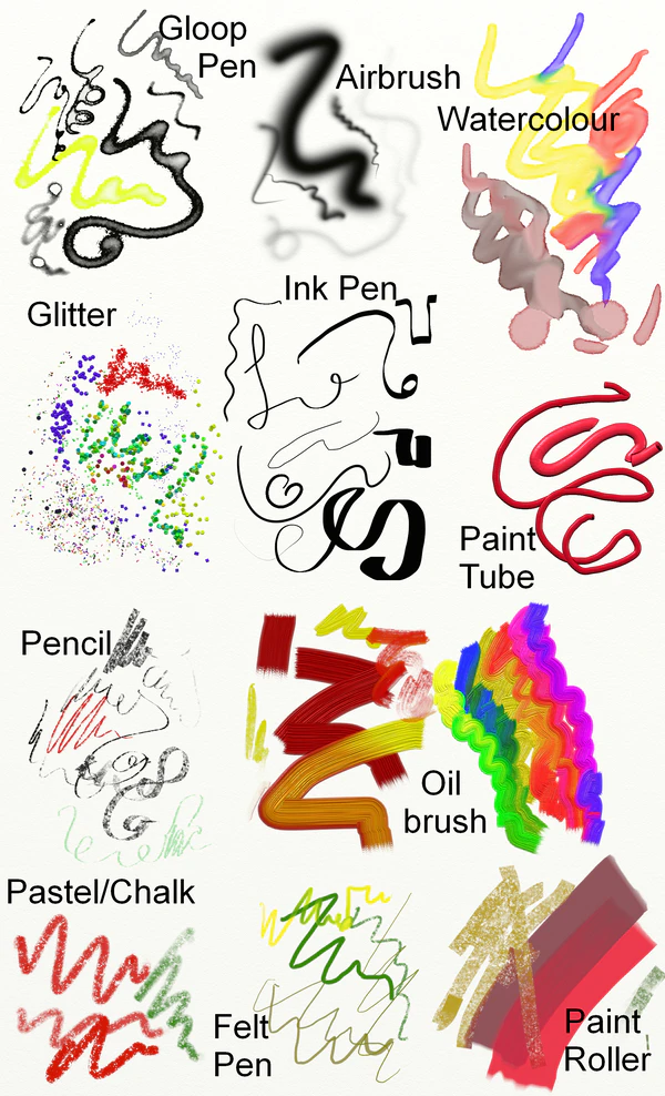 | Аэрограф, гелиевая ручка, блёстки, перьевая ручка, карандаш, кисть для масла, акварель, тюбик с краской, ролик, пастель/мел, маркер, ластик, мастихин, трафареты, разбрызгиватель наклеек, линейки, металлик | Выделение, клонер, заливка, трансформирование, симметрия, градиенты, слои, трассировка, референсные изображения, чёрновые слои, панели обзора, текст, фильтры, размытие слоёв, пресеты, опции холста, настраиваемая рабочая панель, скрипты, сетки, паттерн-заливка, градиентная заливка, пользовательская кисть, перспектива, направляющие, деформация (Liquify) |