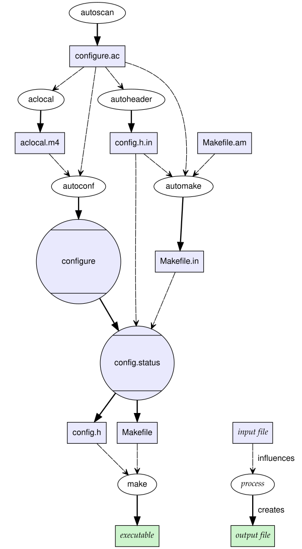 Autoconf читает файл configure.ac (или устаревший configure.in[5]) и генерирует скрипт для настройки под названием configure. Для обработки файлов autoconf использует GNU-реализацию языка макрокоманд m4.