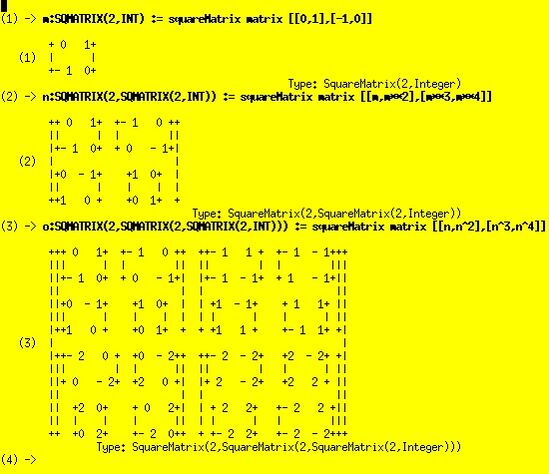 Функция может получить тип в качестве аргумента, и её возвращаемое значение также может быть типом. Например, Fraction — функция, получающая IntegralDomain в качестве аргумента, и возвращающая поле отношений своего аргумента. В качестве другого примера кольцо матриц действительных чисел может быть построено как SquareMatrix(4, Fraction Integer). Конечно, если работать в этом домене, 1 интерпретируется как единичная матрица и A^-1 позволяет получить обратную матрицу A, если она существует.