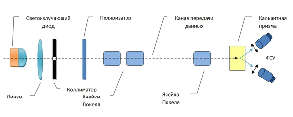 Передатчик формирует одно из четырёх состояний поляризации. Функции ячейки Поккельса — импульсная вариация поляризации потока квантов передатчиком и анализ импульсов поляризации приёмником. Собственно передаваемые данные поступают в виде управляющих сигналов на эти ячейки. В качестве канала передачи данных может использоваться оптическое волокно. В качестве первичного источника света можно использовать лазер. На принимающей стороне после ячейки Поккельса ставится кальцитовая призма, которая расщепляет пучок на два фотодетектора, измеряющие две ортогональные составляющие поляризации.[12]