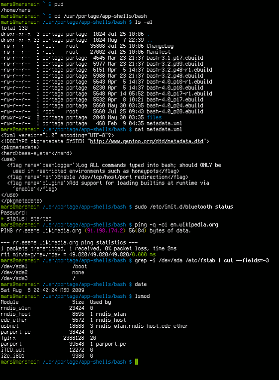 Интерпретатор bash имеет множество встроенных команд, часть из которых имеет аналогичные исполняемые файлы в операционной системе. Однако следует обратить внимание, что чаще всего для встроенных команд отсутствуют man-страницы, а при попытке просмотра справки по встроенной команде на самом деле будет выдаваться справка по исполняемому файлу. Исполняемый файл и встроенная команда могут различаться параметрами. Информация по встроенным командам расписана в справочной странице bash: