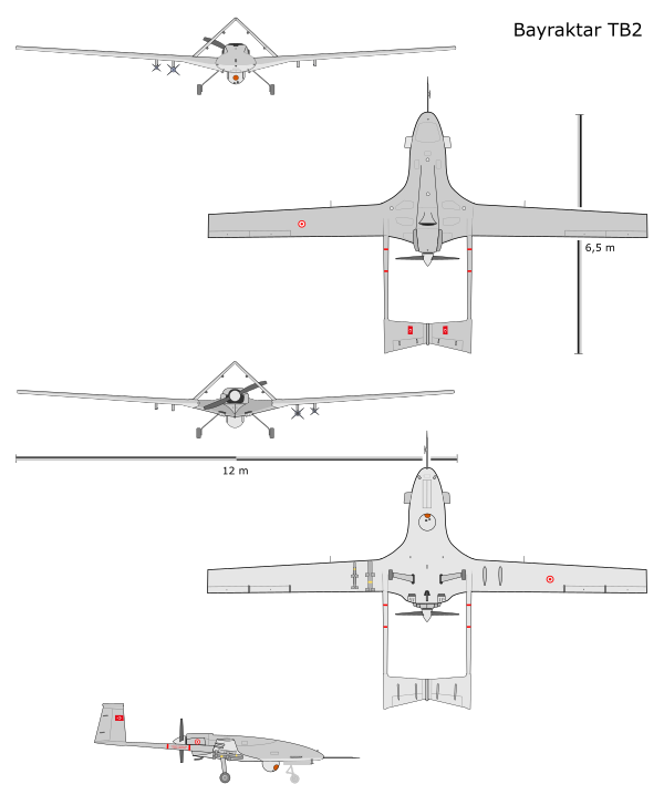 Байракта́р ТБ2 (тур. Bayraktar TB2, досл. — «знаменосец») — ударный оперативно-тактический средневысотный БПЛА турецкой компании «Baykar Makina»[6] с двигателем внутреннего сгорания и воздушным винтом толкающего типа. Bayraktar TB2 с 4 управляемыми боеприпасами на подвеске может находиться в воздухе от 12 до 24 часов. Максимальная дальность управления — до 150 км[7].