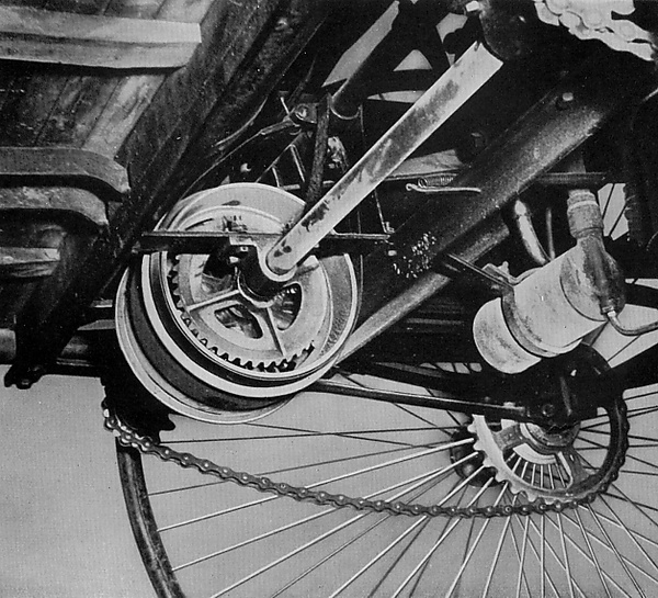 Система трансмиссии представляла собой простейшую конструкцию без сцепления (в его современном представлении), с одной передачей (с 1887 года — две передачи[38]), фиксированными и неуправляемыми шкивами, ремнём и без заднего хода. Тормозная система состояла исключительно из ручного тормоза с ленточным механизмом, который воздействовал на шкив приводного ремня. Ножной тормоз отсутствовал[39].