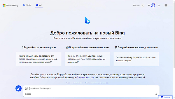 В феврале 2023 года на презентации Microsoft представила обновлённый Bing с ИИ на базе чат-бота ChatGPT[40]. Новый Bing использует генеративный AI в своей функции веб-поиска для возврата результатов, которые выглядят как более длинные, написанные ответы, собранные из различных источников Интернета, а не список ссылок на соответствующие сайты[41]. Чат-бот помимо поисковой функции может поддерживать беседу, генерировать связные тексты, а также отвечать на сложные вопросы[42] за счёт своей обширной языковой модели.