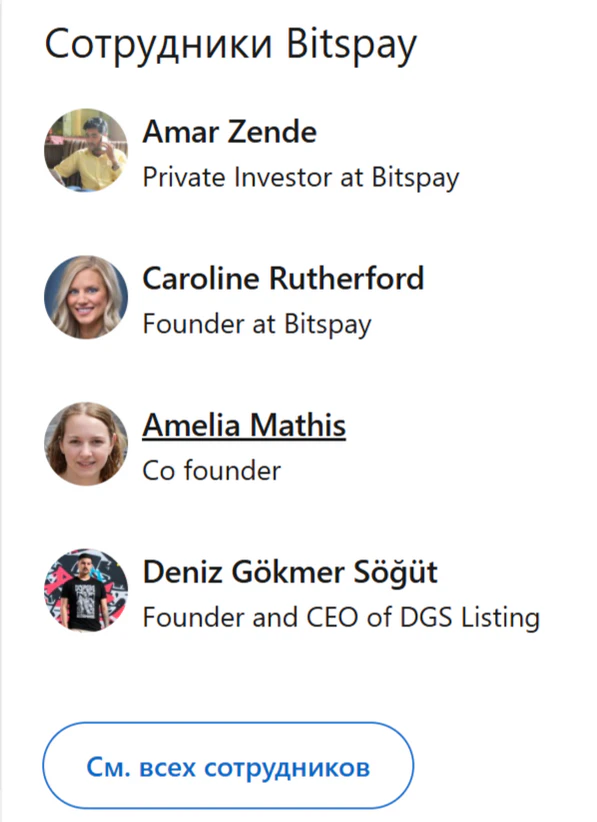 Данные об учредителях и разработчиках, размещенные на официальном сайте компании, не совпадают с аналогичными данными, опубликованными в социальной сети Linkedin. В подписях под фотографией одного и того же человека указаны разные имена и должности. Яндекс- и гугл-карты показывают, что адрес компании в Лондоне, опубликованный на странице Bitspay в Linkedin, физически не существует[7].