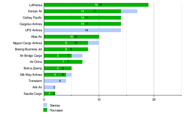 В сентябре 2011 года сразу две грузовые авиакомпании отменили или перенесли заказы на первые экземпляры Boeing 747-8. Американская авиакомпания Atlas Air уменьшила свой заказ с 12 до 9 грузовых самолётов, отказавшись таким образом от первых трёх экземпляров. Авиакомпания Cargolux перенесла исполнение двух своих заказов на более поздний срок[30].