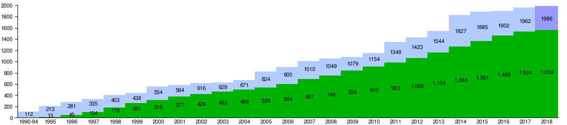 | 1990-94 | 1995 | 1996 | 1997 | 1998 | 1999 | 2000 | 2001 | 2002 | 2003 | 2004 | 2005 | 2006 | 2007 | 2008 | 2009 | 2010 | 2011 | 2012 | 2013 | 2014 | 2015 | 2016 | 2017 | 2018 | |||