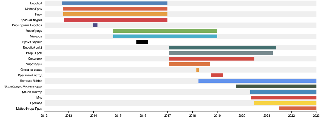 Первой линейкой стартовал «Бесобой», пилотный выпуск которого был издан 1 октября 2012 года[40][15]. Сюжет его повествует об охотнике на демонов Даниле Бесобое, бывшем военном, чья семья погибла по вине демонов, и в теле которого запечатан Сатана. Изначально Данила Бесобой задумывался как «суровый герой без лица», поэтому был придуман чертёнок Шмыг, верный спутник Бесобоя, который вечно шутил, тем самым оттеняя мрачность главного героя[41]. По словам Алекса Хатчетта, ставшего впоследствии сценаристом комикса, особенно сложности в написании сценария добавляло то, что в Даниле Бесобое находился не абы какой демон, а сам Сатана, и именно это сподвигло его на то, чтобы сделать Данилу мифологическим героем. В итоге в сюжете фокус с Бесобоя был смещён на других персонажей и устройство вселенной, что позволило объяснить структуру мира комикса[42].