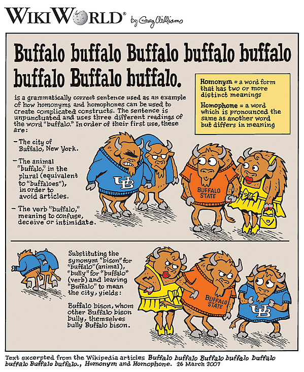 «Buffalo buffalo Buffalo buffalo buffalo buffalo Buffalo buffalo» — грамматически корректная фраза на английском языке, используемая для иллюстрации того, как омонимы и омофоны могут быть использованы для создания сложных конструкций.