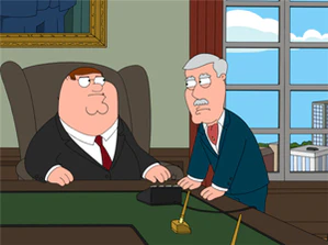 Первым делом он увольняет в полном составе Совет директоров процветающей компании и нанимает на их место Брайана, Куагмира и Морта Голдмана.
