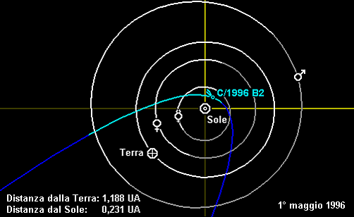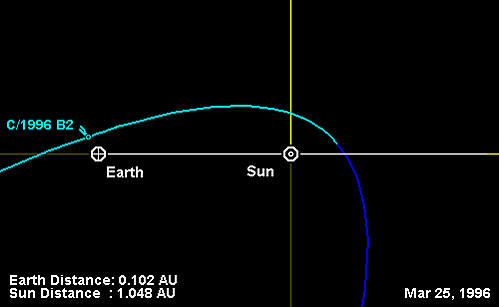 Первые расчёты орбиты кометы, выполненные руководителем Центрального бюро астрономических телеграмм Брайаном Марсденом 3 февраля[11], показали, что 25 марта 1996 года комета пройдёт примерно в 0,1 а. е.[прим 2] от Земли[12]. Для комет это очень малое расстояние: в прошлом веке только четыре «хвостатые странницы» проходили ближе: С/1983 H1 (IRAS — Араки — Алкока), 7P/Понса — Виннеке, 73P/Швассмана — Вахмана и C/1983 J1 (Сугано — Сайгусы — Фудзикавы)[13].