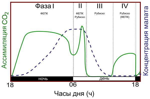 Фаза I начинается ночью с открытия устьиц. В ходе этой фазы происходят первичное связывание СО2 ФЕП-карбоксилазой (ФЕПК) в виде малата и запасание его в вакуоли. В конце фазы I устьица закрываются. Фаза II происходит в ранние утренние часы, когда ФЕП-карбоксилаза становится неактивной, а Рубиско постепенно активируется. Воздействие света и низкие уровни цитозольного СО2 заставляют устьица оставаться открытыми. В этой фазе происходит дополнительная фиксация СО2, причём фиксация идёт двумя ферментами сразу. С наступлением жары и усиления инсоляции растение вступает в фазу III. Во время этой фазы устьица остаются закрытыми, а малат высвобождается из вакуолей и декарбоксилируется, образуя СО2 который ассимилируется Рубиско в цикле Кальвина. По мере декарбоксилирования малата концентрация СО2 возрастает, а малата падает. Фаза IV наступает в предзакатные часы, когда запасы малата уже исчерпаны. Устьица могут открыться, и CO2 фиксируется напрямую ещё активной Рубиско, поступая в цикл Кальвина[34].
