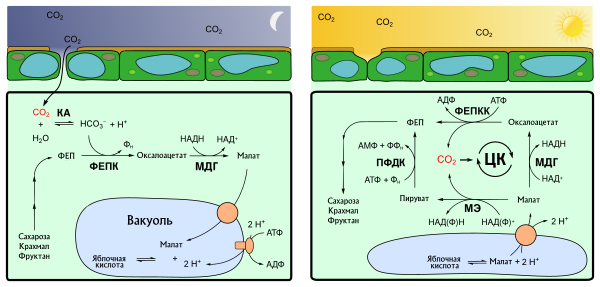 После рассвета, с наступлением дневной жары САМ-растения закрывают устьица, чтобы избежать потерь влаги. Запасённый в течение ночи малат и связанные с ним два протона днём не совсем понятным образом экспортируется из вакуоли по малатному каналу. В результате в течение дня значение рН в вакуоли вновь увеличивается, достигая значений 7,5-8,0[25].