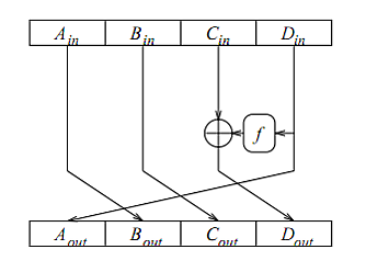 XOR вектор (0, 0, 0, ) заданных разниц, для 4 входных 32-битных субблоков, где 3 первых субблока (Ain, Bin и Cin) имеют нулевые XOR разницы, а 4-й входной субблок (Din в раунде) имеет некоторую отличную от нуля XOR разницу, .
