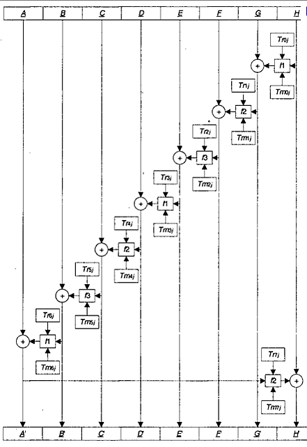 где Xi представляет входные 32-бита данных, Wj входные 8-бит данных в Sj функции, Kmi и Kri представляют маскирующий подключ и подключ сдвига соответственно, Yi, есть выходные 32-бита данных, после воздействия раундовой функции, «» операции «+» и «-», представляют собой сложение и вычитание соответственно по модулю 2. Обозначение «» представляет левый сдвиг V по отношению к U. W, Xi, Yi и Kmi, все они представляют собой 32-битные субблоки. Kri имеет длину 5 бит. Расшифровывание осуществляется по аналогии с шифрованием, с той лишь разницей, что подключи используются в обратной последовательности.