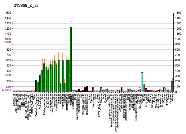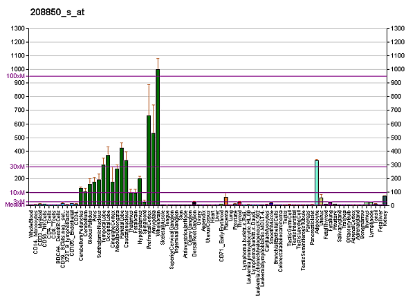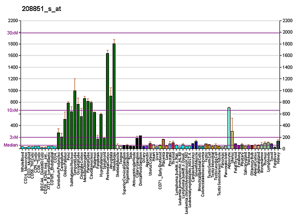 - Нервная ткань. В нервной ткани Thy-1 экспрессирован в основном на нейронах, но некоторые глиальные клетки также могут продуцировать Thy-1, в особенности на поздних этапах дифференцирования. Клеточные линии человека нейроглиального происхождения, многие линии нейронального происхождения и большинство опухолевых клеток имеют высокий уровень экспрессии Thy-1[9]. В мозге особенно высокий уровень Thy-1 отмечен в полосатом теле и гиппокампе, за которыми следуют новая кора, мозжечок, спинной мозг, сетчатка и зрительный нерв. Промотор гена Thy-1 считается специфическим для мозга и этот нейроно-специфический промотор Thy-1 экспериментально используется для экспрессии нужного белка в мозге, например мутации белка APP как модели болезни Альцгеймера у мышей[10]. Экспрессия Thy-1 в мозге регулируется в ходе развития. Его уровень в мозге новорожденных очень низкий и экспоненциально повышается в процессе созревания мозга.