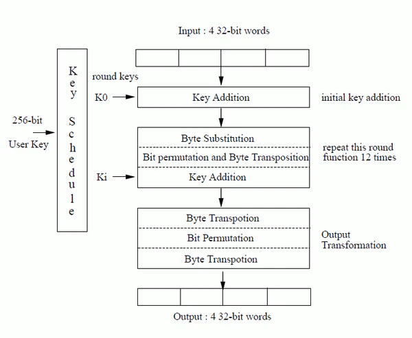 Заметим, именно 12 раундов шифрования рекомендуется автором алгоритма Че Хун Лимой, однако строгое количество раундов не установлено. Кроме 12 раундов шифрования, перед первым раундом алгоритма выполняется предварительная операция , а по завершении 12 раундов выполняется выходное преобразование , состоящее из последовательно выполняемых операций , и .