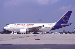 Airbus A310-300 в аэропорту Париж-Шарль де Голль в 2001 году. На нем была гибридная ливрея Canada 3000/Royal Aviation после того, как покупки последней