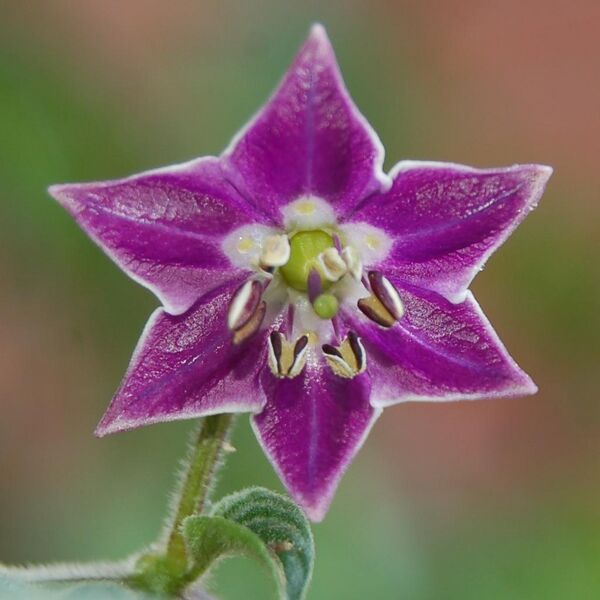 Цветки появляются поодиночке или парами (редко до четырех) на побегах, а их ветви имеют длину около 1 см, стебли цветка доходят до плода примерно до 4-5 см. Чашечка имеет пять треугольных заостренных зубцов, длина которых у плода около 1 мм. Отличительной особенностью, отличающейся от других культурных видов рода Capsicum, являются лепестки сине-фиолетового цвета, более яркие в центре. Пыльники частично пурпурные, частично белые.[7]