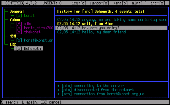 CenterIM — универсальное средство мгновенного обмена сообщениями, распространяющееся под лицензией GNU GPL и поддерживающее протоколы OSCAR (его используют сервисы ICQ и AIM), Yahoo!, IRC, MSN, Gadu-Gadu и XMPP (Jabber). Месседжер использует псевдографическую библиотеку ncurses, что позволяет использовать его удалённо (например через ssh или telnet). Форк заброшенного CenterICQ[1].