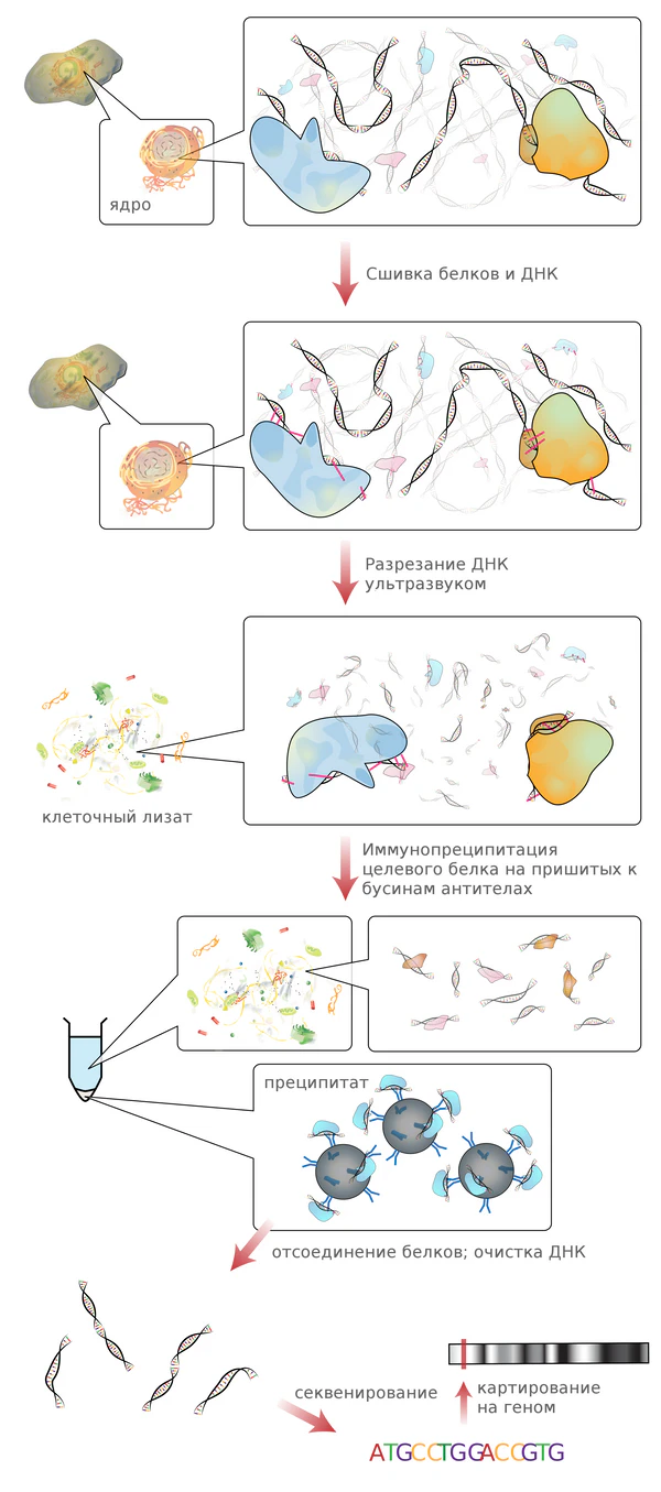 Иммунопреципитация хроматина — метод, используемый для специфического накопления коротких последовательностей ДНК, связанных с исследуемым белком в живых клетках[5]. Типичная методика включает в себя следующие стадии[5]: