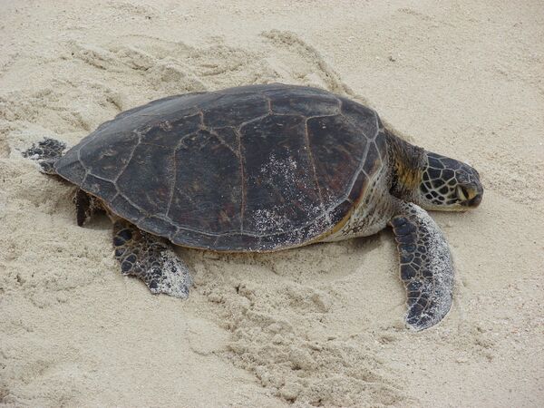 Зелёная черепаха — крупная, длина панциря от 80 до 150 см, масса — от 70 до 200 кг, очень редко достигает длины 200 см и массы 400—500 кг[8].