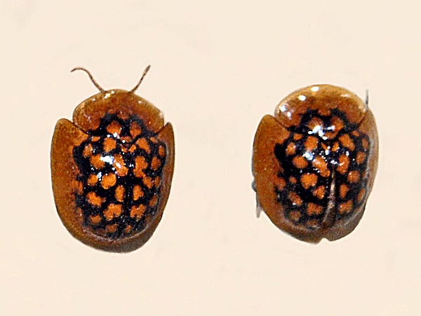 Тело овальной, практически округлой формы, уплощённое, желтовато-песочного цвета с чёрными пятнами и полосами на дорсальной стороне тела. Голова сверху не видна, так как прикрыта переднеспинкой. Тело в длину может достигать 5-6 миллиметров, в ширину — 4-5 миллиметров. Надкрылья чёрные со слабыми зелёными пятнами. Они окружены желтоватой линией по всему краю дисков переднеспинки и надкрылий (у высушенных экземпляров такая линия и пятна становятся красновато-коричневыми). Голова, вентриты, ноги и усики жёлтые. Наиболее похожим видом является Chiridopsis rubromaculata, но он отличается красной окраской пятен[3].