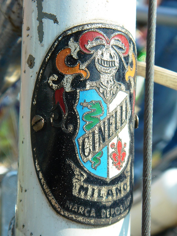 Cinelli (MILANO) head badge первоначально была перегородчатой (из стекла на латуни) и 55 мм в высоту. Вскоре после этого (c.1953) он был расписан вручную эмалью и высотой 56 мм. Примерно в 1958 году его высота уменьшилась до 51 мм. В 1978 году она стала декалью. В дизайне был изображён шлем рыцаря, вдохновлённый семейной реликвией, с красной лилией — символом Флоренции — и зелёной змеёй, символом Милана.