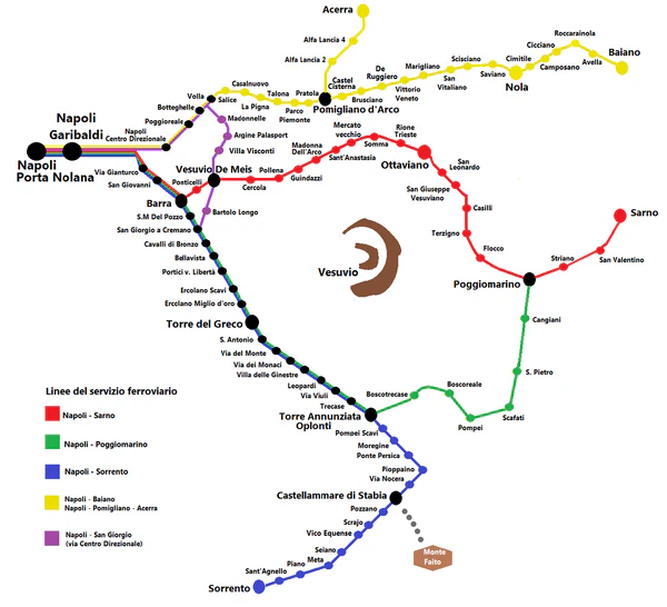 Все линии начинаются на станции Napoli Porta Nolana, затем проходят через Napoli Garibaldi, потом разделяются и расходятся в разные стороны.
