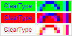 - ClearType даёт хорошие результаты только при выводе тёмного текста на светлом фоне или светлого текста на тёмном фоне. Наибольшее качество получается, если чёрный текст выводить на белом фоне (или наоборот). Попытки вывода цветного текста или использования цветного фона не дают высокого качества конечного изображения, так как часть субпикселей не задействована. Например, если выводить белый текст на красном фоне, красные субпиксели будут зажжены и для текста, и для фона.