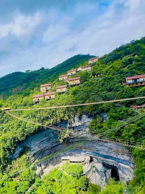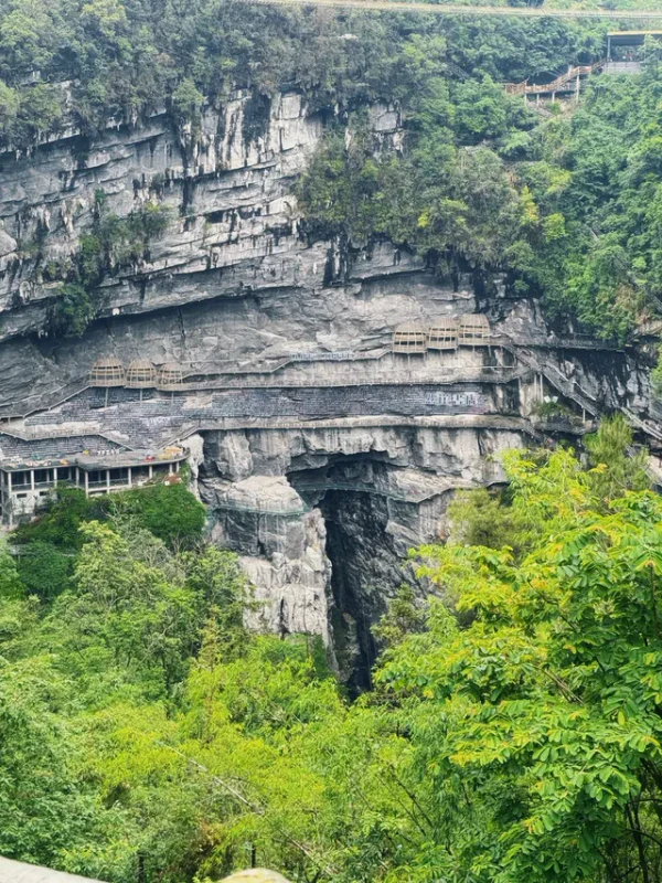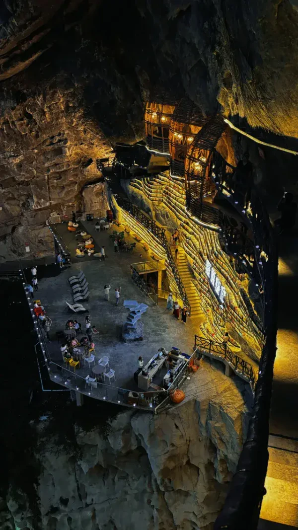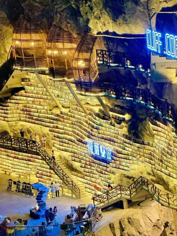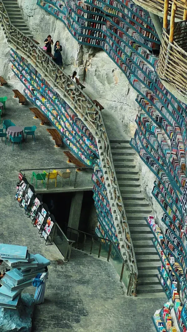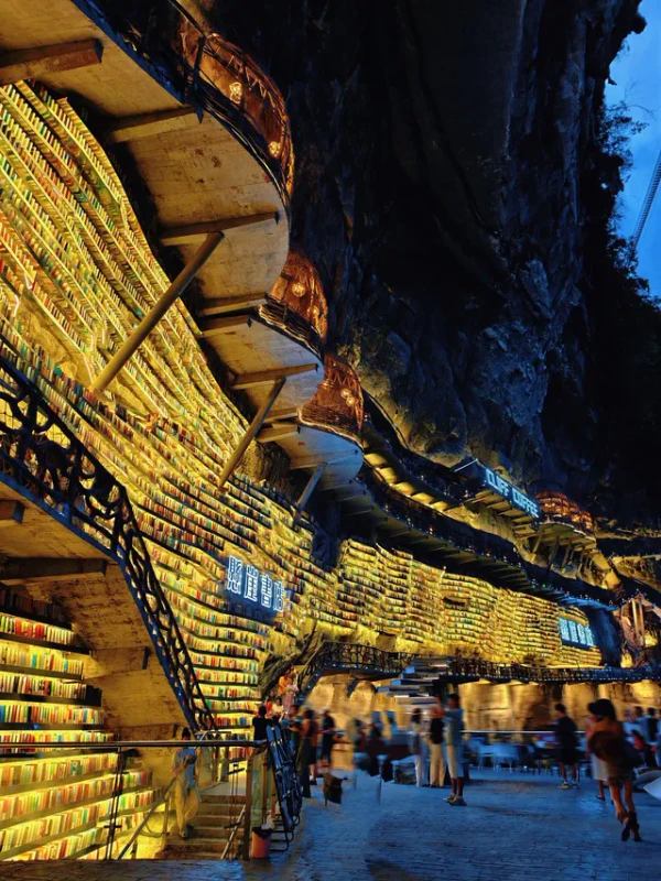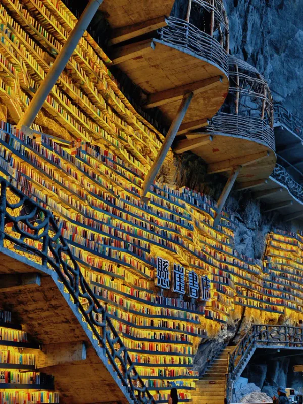 Книжный магазин Cliff Bookstore находится на уступе карстовой воронки Мяньхуа Тянькэн (координаты: 24,791586° с. ш. 108,785711° в. д.) в деревне Мяньхуа города Сыба уезда Луочэн-Мулао. Воронка имеет глубину около 326 м и ширину около 305 м[15]. Магазин служит местом отдыха для туристов, идущих по дощатой тропе длиной 1600 метров, проложенной вдоль скалы. Каркас конструкции состоит из дерева, стекла и стали; полки и террасы вырезаны прямо в скале. Днём помещение освещается естественным светом через панорамные окна, а вечером включается мягкая подсветка, создающая иллюзию «парящего в небе замка»[16].