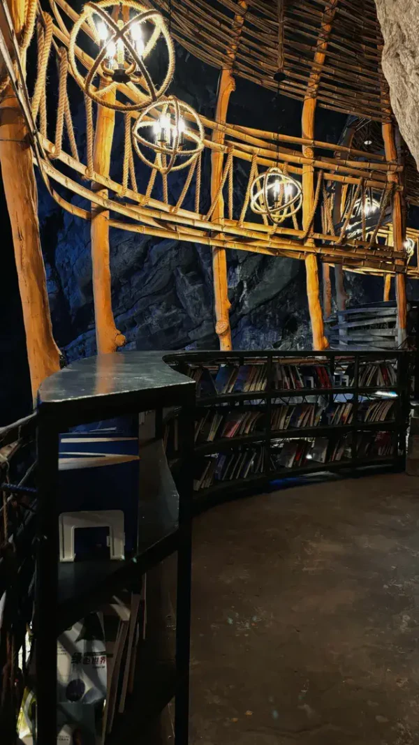 Книги в магазине можно читать на месте или приобретать. Ассортимент включает литературу по искусству, философии и истории, а также популярные издания. Внутри оборудованы лаунж-зоны и кафе с панорамным видом на пропасть. Рядом с магазином также расположены кафе на утёсе и «Большой театр Тянькэн» — сценическая площадка площадью 800 м², находящаяся в центре воронки[16]. Предусмотрены отдельные пространства для чтения, проведения лекций и творческих мастерских.